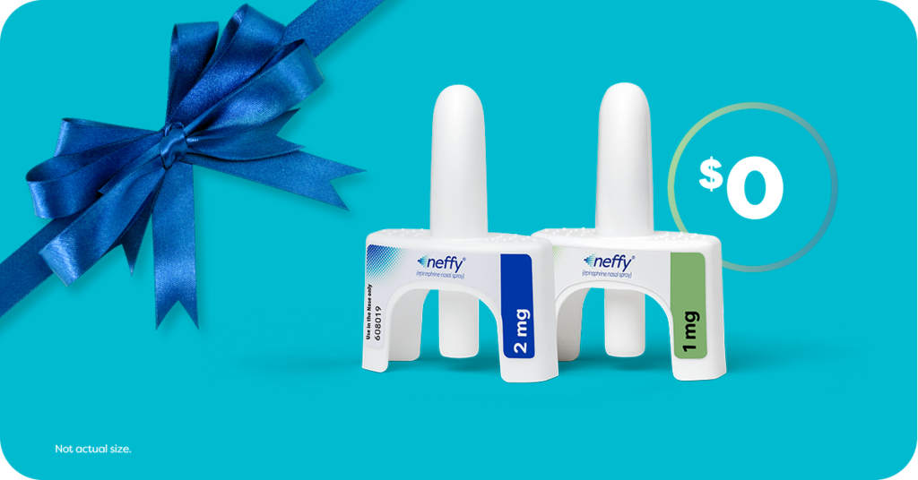 The holidays bring meals, parties, and travel. But for families managing allergic reactions, the season can also require extra preparation. This year, stock up on neffy® (epinephrine nasal spray), the only needle-free epinephrine. Don’t wait! Book a FREE* virtual visit today. Get neffy on us! Pay as little as $0 with commercial insurance, if eligible. neffy is portable, designed to be easy to use, and starts to work in under a minute, so you can be prepared if an allergic reaction starts.